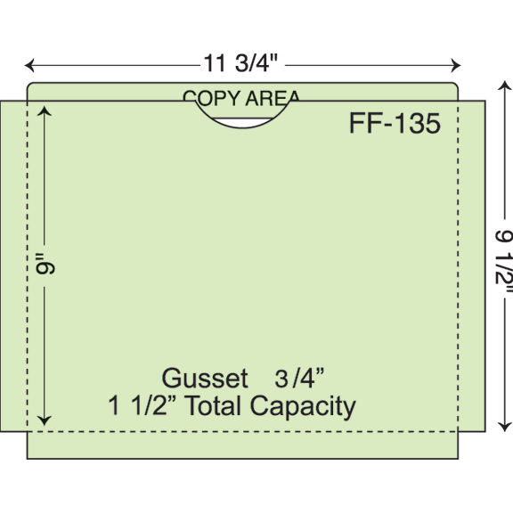 Custom printed file folder document sleeve with glued sides and 1.5″ expansion. Full tab with double thick reinforcement. Thumb cut on top panel, 1 1/2″ expansion capacity with glued edges. Shipped flat with gussets out.