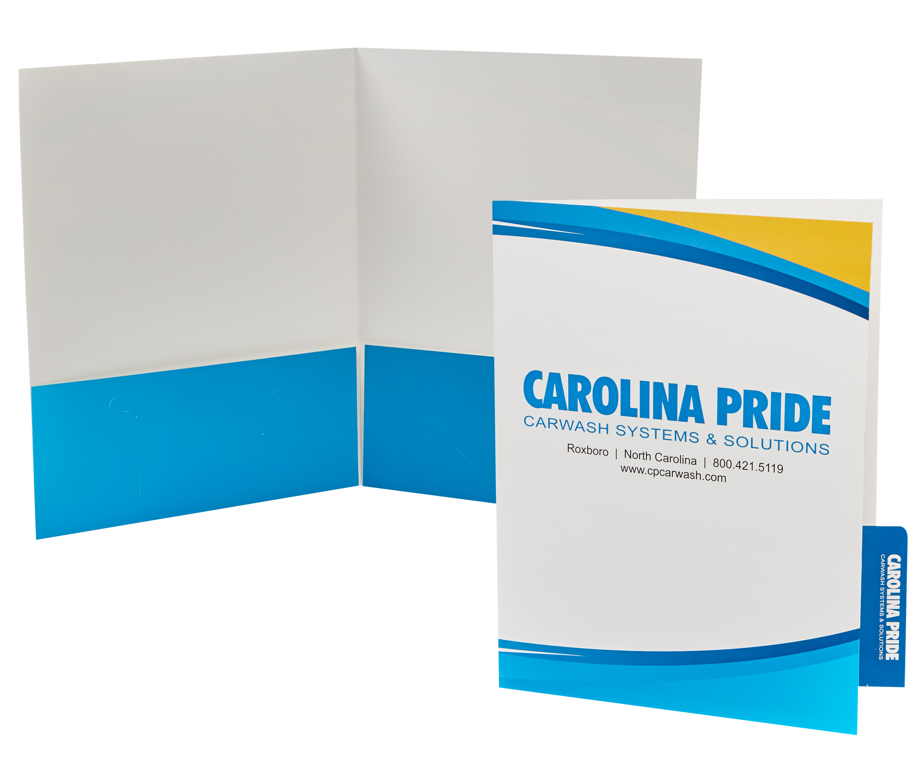 Letter size double pocket presentation folders with tab extension on right pocket. Single scored spine. One or two pockets. Double thick tab on right pocket.