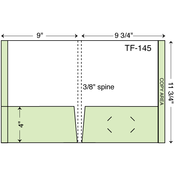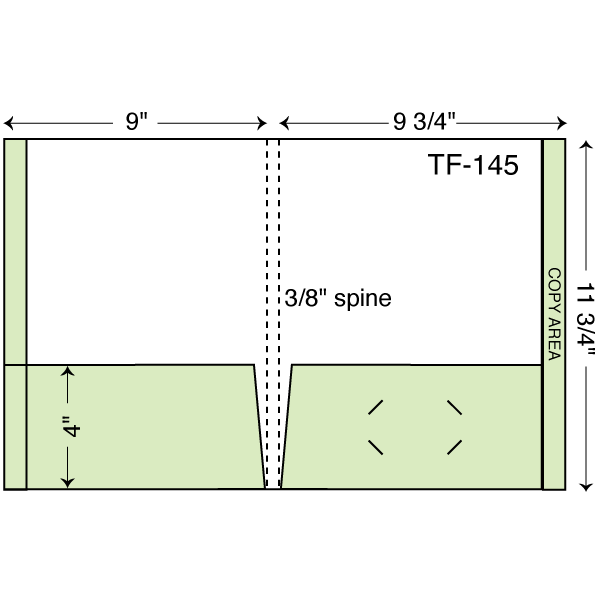 Letter size 2 pocket folders with full reinforced tab on both sides & 3/8″ spine. Double scored spine. Two reinforced pockets with full tab on right pocket.